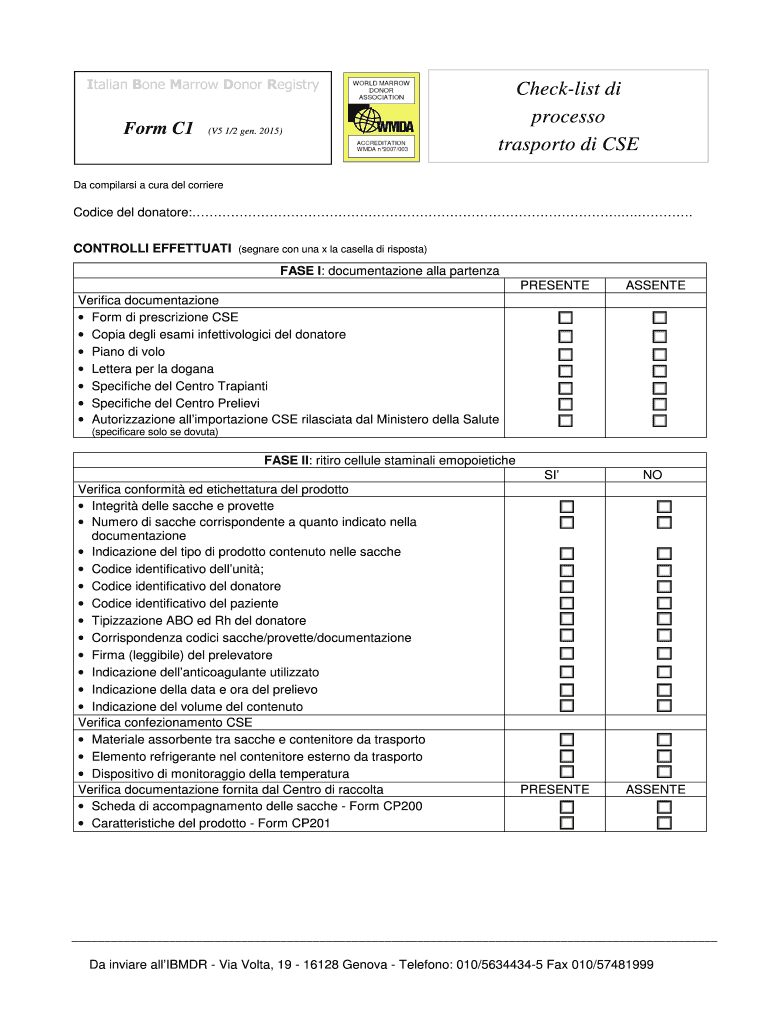 Reset Italian Bone Marrow Donor Registry Form C1 (V5 1/2 gen. 2015) Checklist DI process transport DI CSE The compilers a Cuba Del corriere Codices Del dona tore:... CONTROL LI EFFECTUATE (signal
