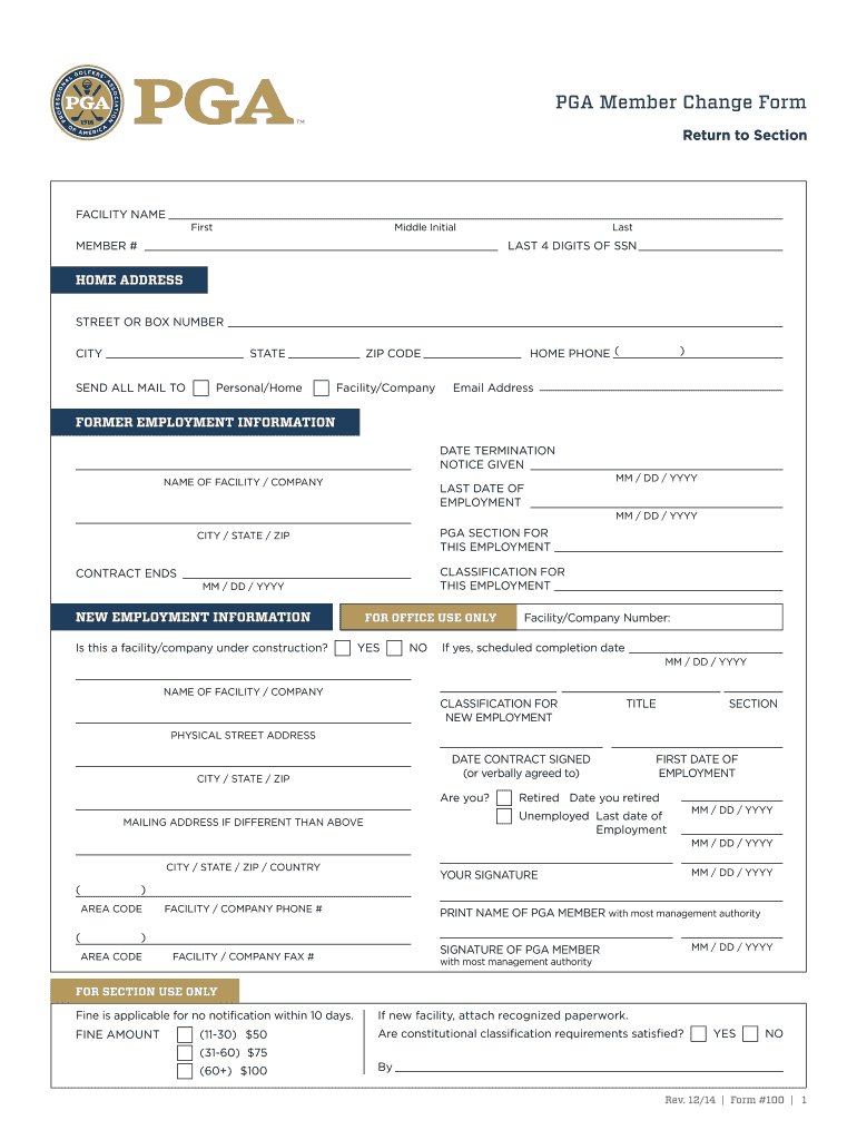 PGA Member Change Form Return to Section FACILITY NAME First Middle Initial MEMBER # Last 4 DIGITS OF SSN HOME ADDRESS STREET OR BOX NUMBER CITY STATE SEND ALL MAIL TO Personal/Home PHONE (ZIP CODE