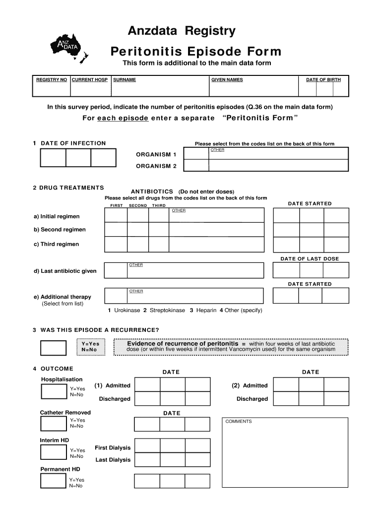Anzdata Registry Peritonitis Episode is not the form you're looking for?Search for another form here.