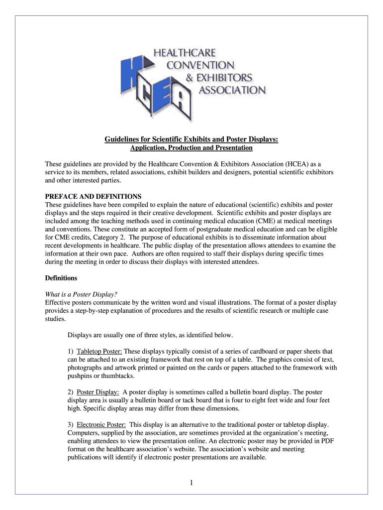 Guidelines for Scientific Exhibits and Poster Displays: Application, Production and Presentation These guidelines are provided by the Healthcare Convention & Exhibitors Association (CEA) as a service