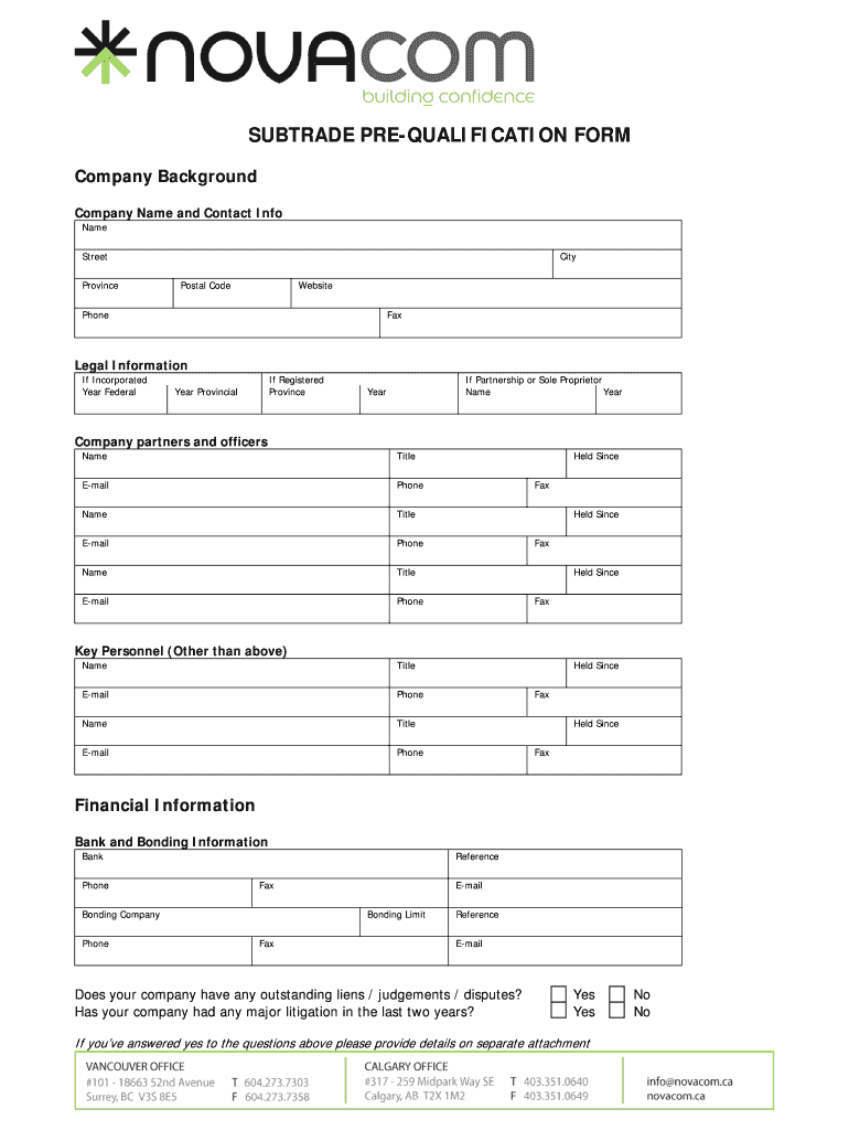 Get the free SUBTRADE PRE-QUALIFICATION FORM - Novacom Construction - novacom