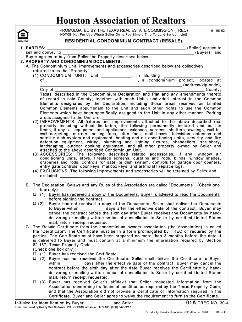 Houston Association of Realtors PROMULGATED BY THE TEXAS REAL ESTATE COMMISSION (TREE) 010603 NOTICE: Not For Us e W here Seller Owns Fee Simple Title To Land Beneath Unit RESIDENTIAL CONDOMINIUM