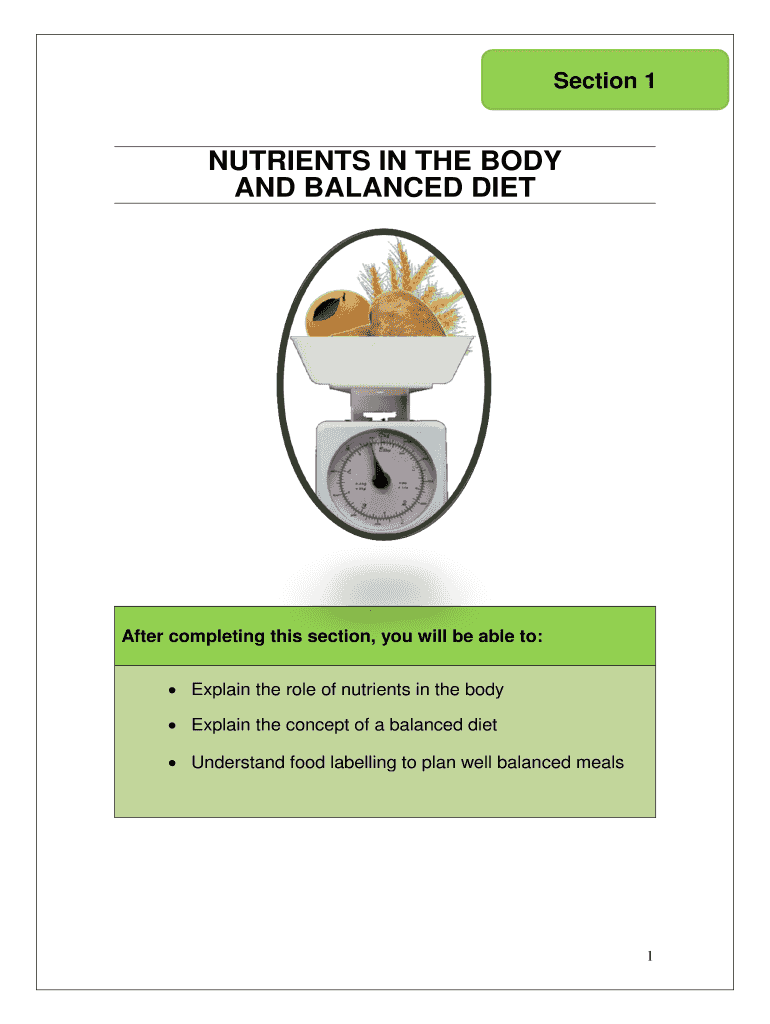 Section 1 NUTRIENTS IN THE BODY AND BALANCED DIET After completing this section, you will be able to: Explain the role of nutrients in the body Explain the concept of a balanced diet Understand food