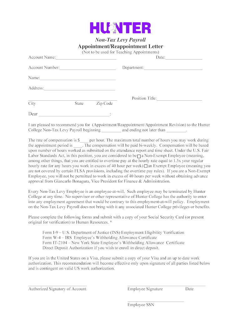Non-Tax Levy Payroll Appointment/Reappointment Letter (Not to be used for Teaching Appointments) Account Name: Date: Account Number: Department: Name: Address: City State Zip Code Position Title: