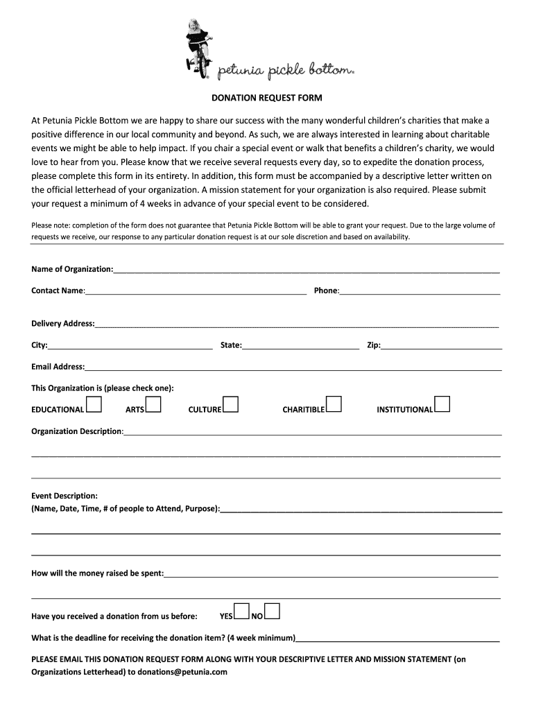 Get the free DONATION bREQUESTb FORM At Petunia Pickle Bottom we are bb