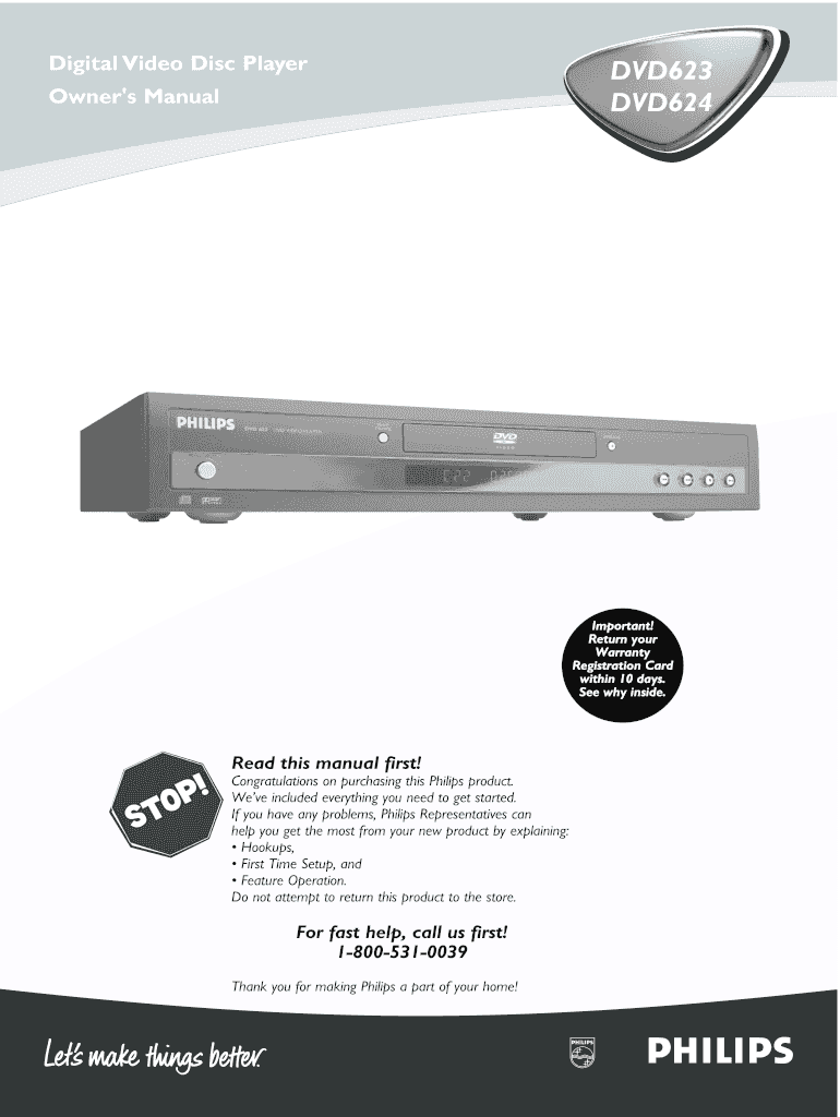 This manual provides information on the features, setup, and operation of the Philips DVD623/DVD624 Digital Video Disc Player, including safety precautions, troubleshooting, and warranty details.