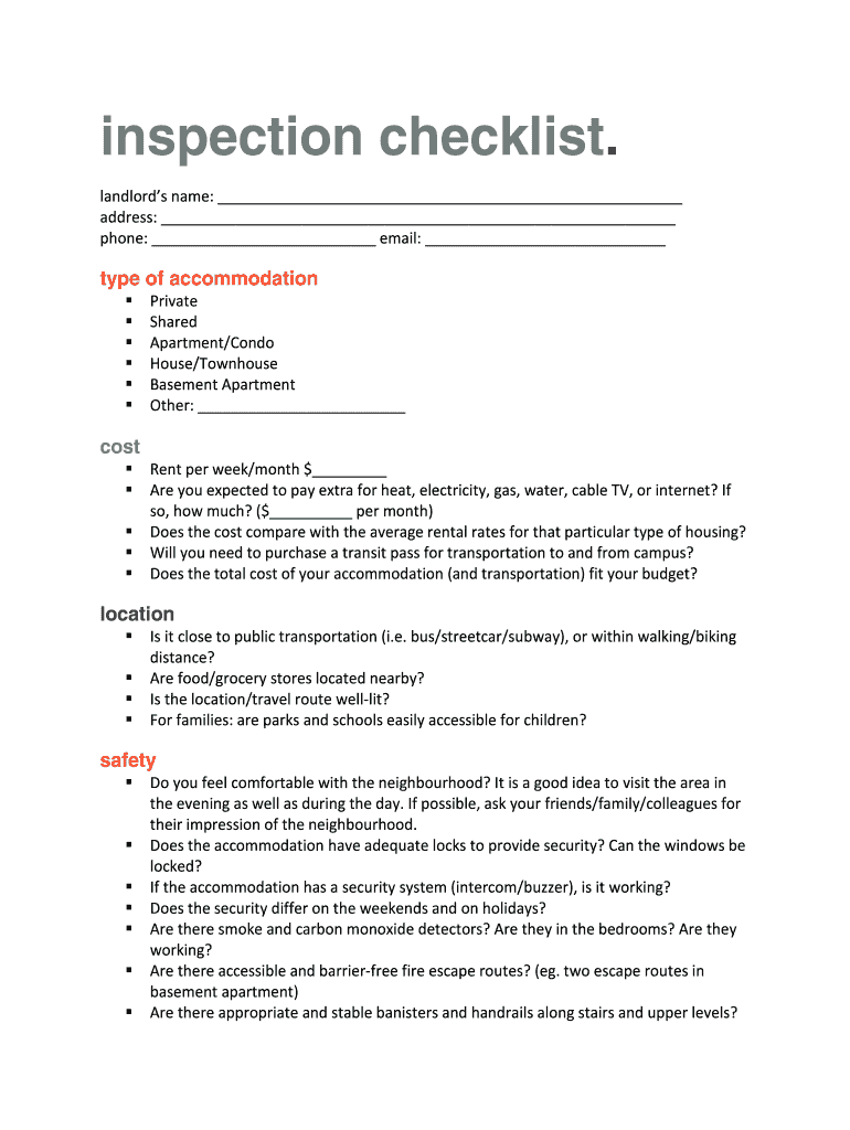 Inspection checklist. Landlords name: address: phone: email: type of accommodation cost Private Shared Apartment/Condo House/Townhouse Basement Apartment Other: Rent per week/month $ Are you expected