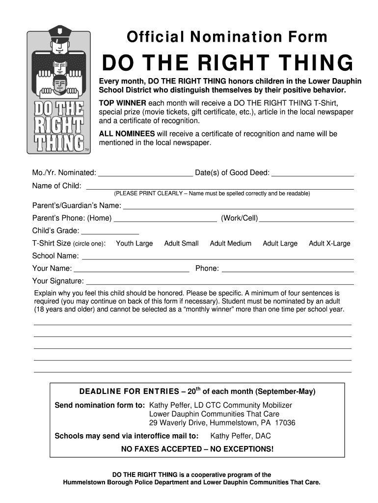 Official Nomination Form Does THE RIGHT THING Every month, DO THE RIGHT THING honors children in the Lower Dauphin School District who distinguish themselves by their positive behavior. TOP WINNER
