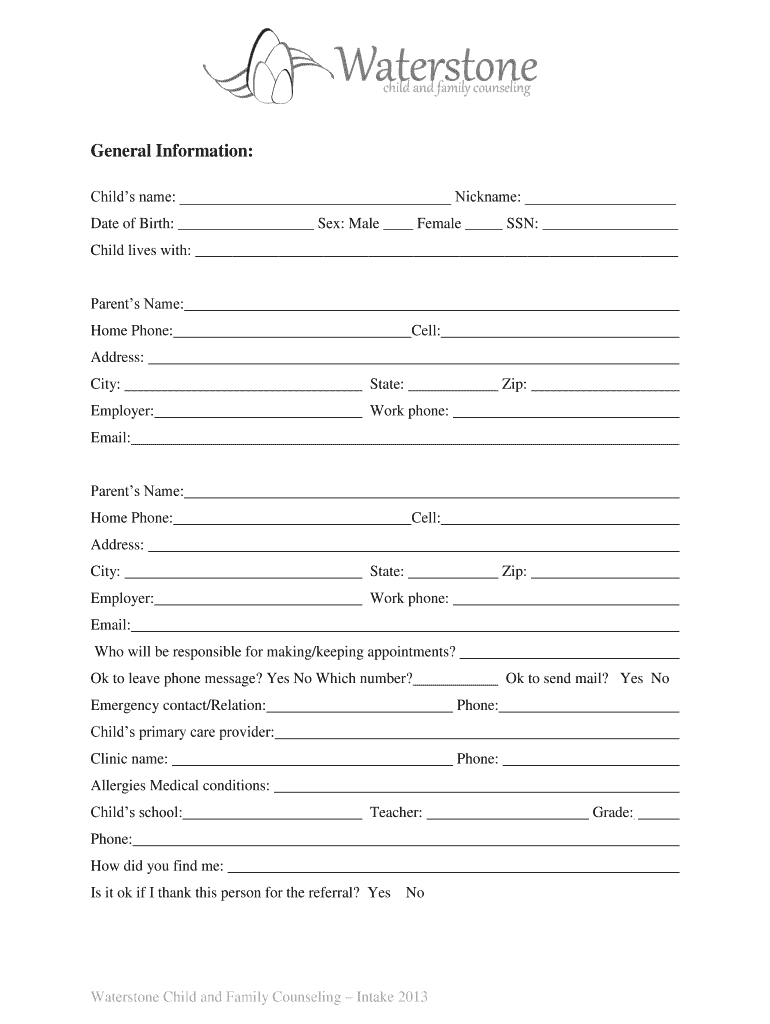 Get the free Child and Teen Counseling Intake Form - Waterstone Child and