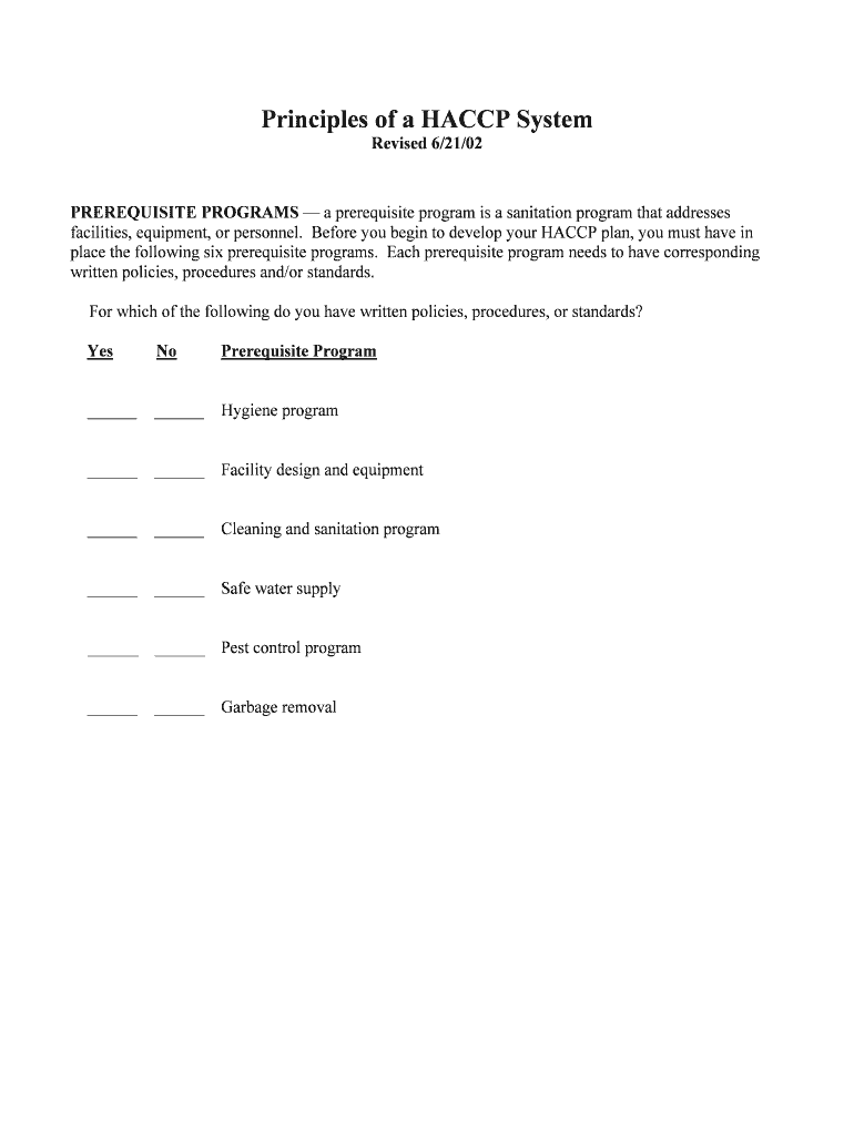 Principles of a HACCP System Revised 6/21/02 PREREQUISITE PROGRAMS a prerequisite program is a sanitation program that addresses facilities, equipment, or personnel. Before you begin to develop your