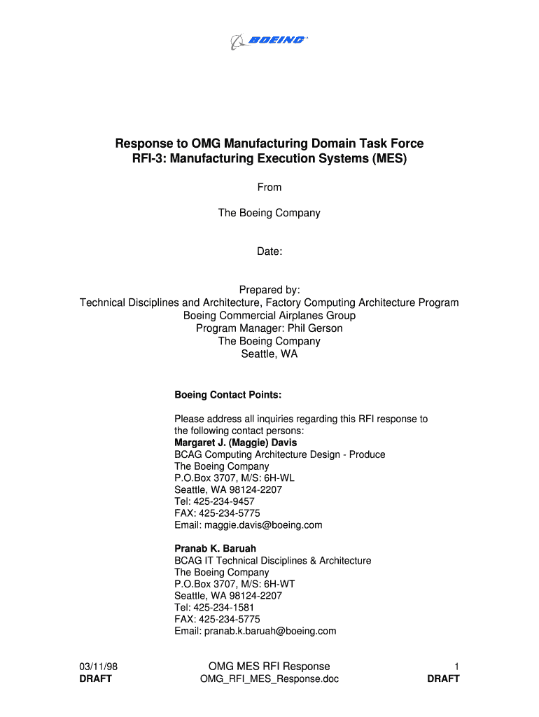 Response to OMG Manufacturing Domain Task Force RFI3: Manufacturing Execution Systems (MES) From The Boeing Company Date: Prepared by: Technical Disciplines and Architecture, Factory Computing Architecture