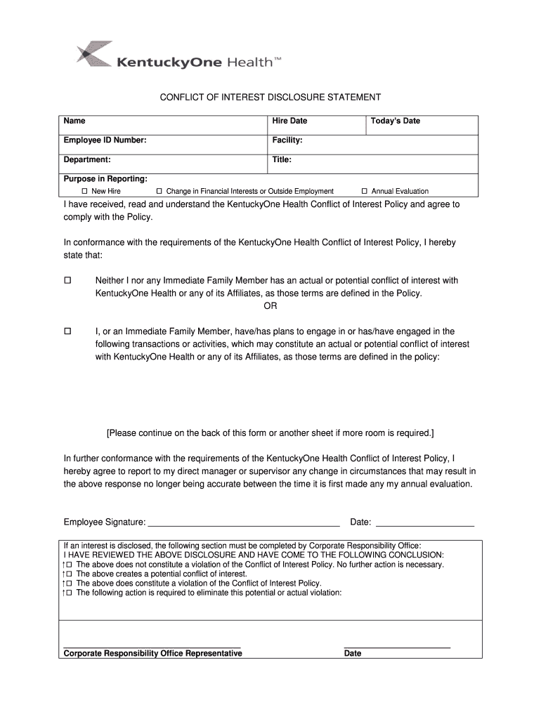 CONFLICT OF INTEREST DISCLOSURE STATEMENT Name Hire Date Employee ID Number: Facility: Department: Today's Date Title: Purpose in Reporting: New Hire Change in Financial Interests or Outside Employment
