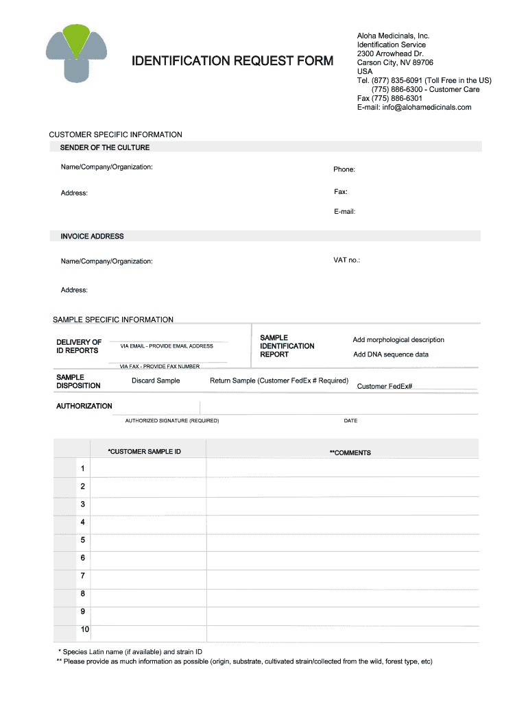 Aloha Medicinal, Inc. Identification Service 2300 Arrowhead Dr. Carson City, NV 89706 USA Tel. (877) 8356091 (Toll Free in the US) (775) 8866300 Customer Care