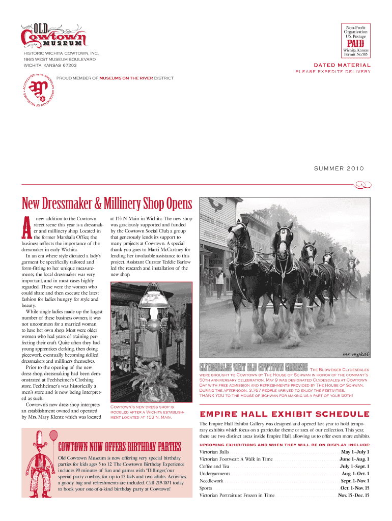 Nonprofit Organization U.S. Postage PAID Wichita, Kansas Permit No.585 Historic Wichita Cow town, Inc. 1865 West Museum Boulevard Wichita, Kansas 67203 d at e d m at e r i an l please expedite delivery