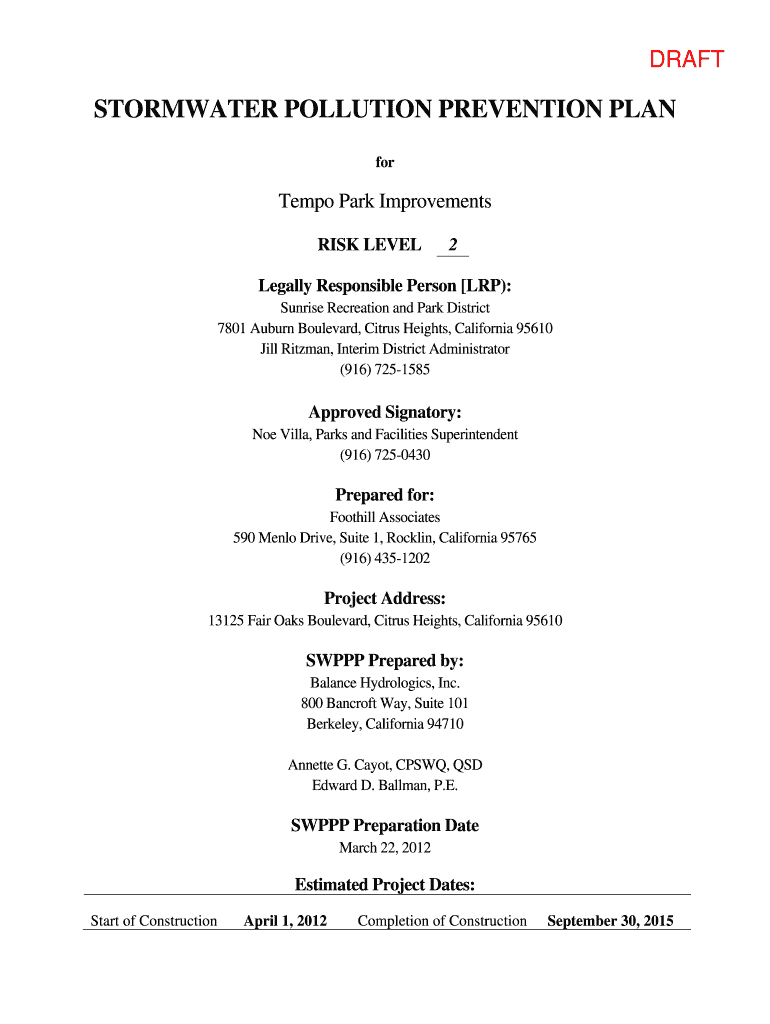 DRAFT STORMWATER POLLUTION PREVENTION PLAN for Tempo Park Improvements RISK LEVEL 2 Legally Responsible Person LRP): Sunrise Recreation and Park District 7801 Auburn Boulevard, Citrus Heights, California