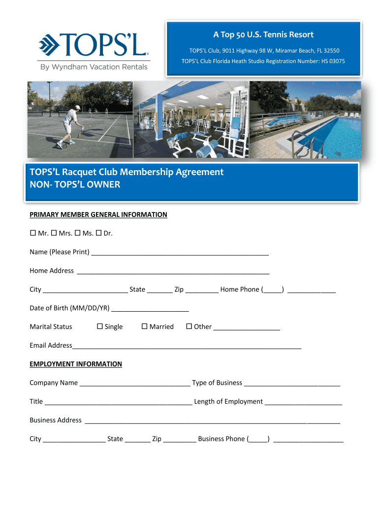 A Top 50 U.S. Tennis Resort TOPS Club, 9011 Highway 98 W, Miramar Beach, FL 32550 TOPS Club Florida Heath Studio Registration Number: HS 03075 TOPS Racquet Club Membership Agreement NON TOPS OWNER