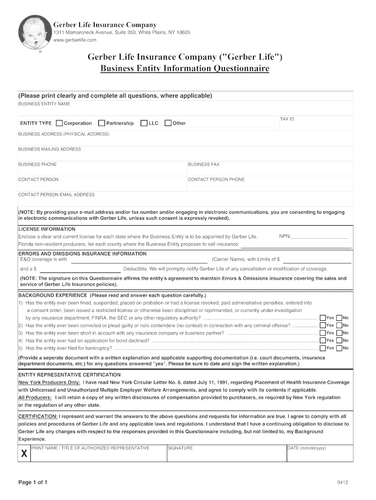 Gerber Life Insurance Company 1311 Mamaroneck Avenue, Suite 350, White Plains, NY 10605 www.gerberlife.com Gerber Life Insurance Company (“Gerber Life “) Business Entity Information Questionnaire
