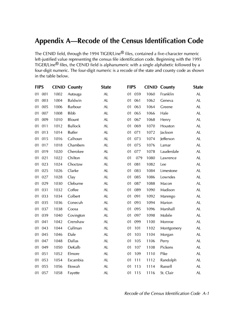 Appendix Are code of the Census Identification Code The ENID field, through the 1994 TIGER/Line files, contained a five character numeric left justified value representing the census file identification