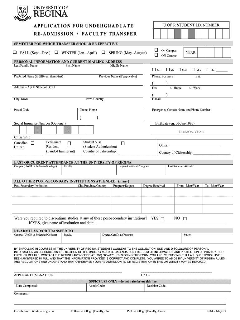 U OF R STUDENT I.D. NUMBER APPLICATION FOR UNDERGRADUATE READMISSION / FACULTY TRANSFER SEMESTER FOR WHICH TRANSFER SHOULD BE EFFECTIVE FALL (Sept. Dec.) WINTER (Jan. April) Campus SPRING (May August)
