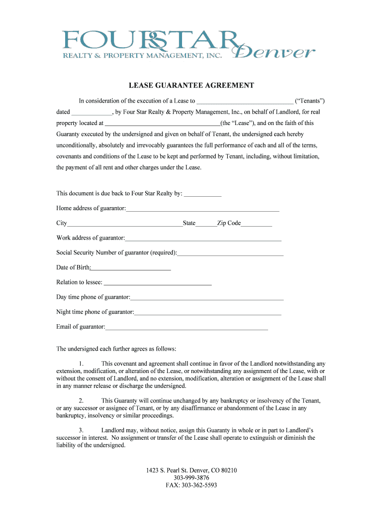 LEASE GUARANTEE AGREEMENT In consideration of the execution of a Lease to (Tenants) dated, by Four Star Realty & Property Management, Inc., on behalf of Landlord, for real property located at (the