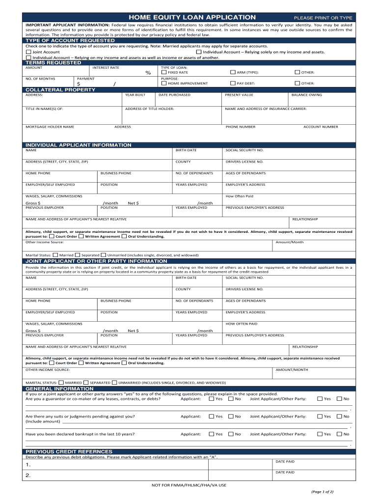 HOME EQUITY LOAN APPLICATION PLEASE PRINT OR TYPE IMPORTANT APPLICANT INFORMATION: Federal law requires financial institutions to obtain sufficient information to verify your identity. You may be