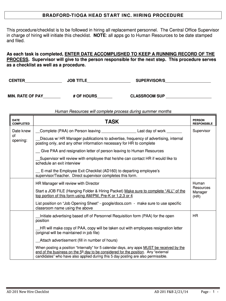 BRADFORDTIOGA HEAD START INC. HIRING PROCEDURE This procedure/checklist is to be followed in hiring all replacement personnel. The Central Office Supervisor in charge of hiring will initiate this
