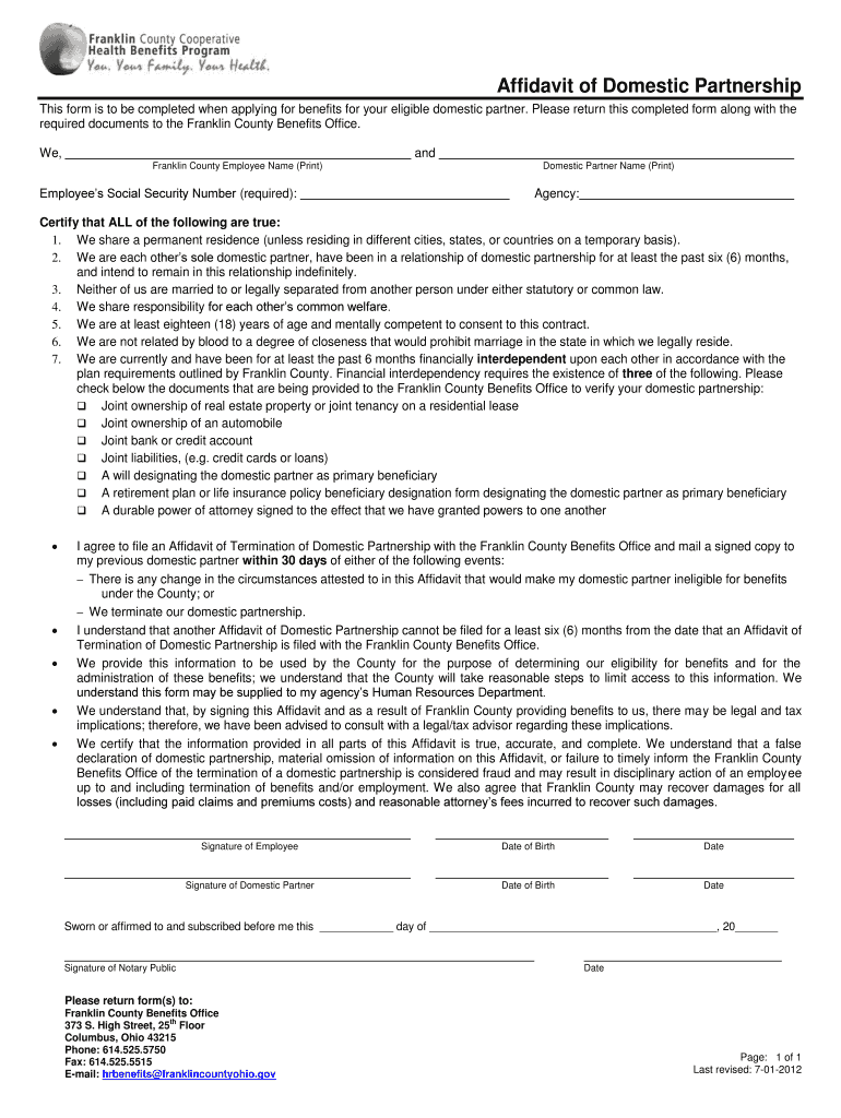 Get the free Affidavit of Domestic Partnership - franklincountyohiogov