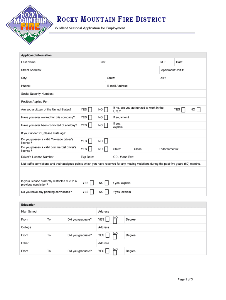 R ROCKY M MOUNTAIN F IRE DI STRICT Wild land Seasonal Application for Employment Applicant Information Last Name: First: M.I.: Street Address: Date: Apartment/Unit #: City: State: ZIP: Phone: Email