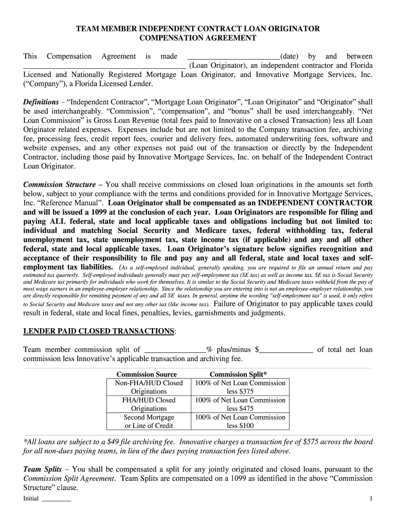 Get the free TEAM MEMBER INDEPENDENT CONTRACT LOAN ORIGINATOR COMPENSATION AGREEMENT This Compens...