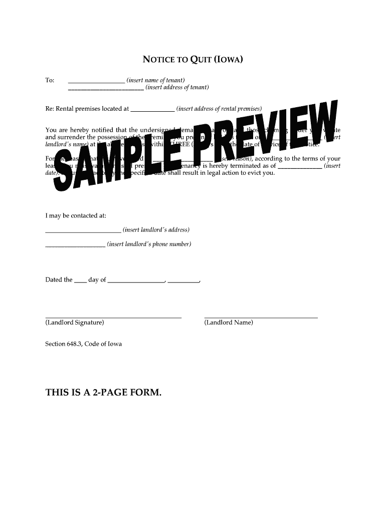 NOTICE TO QUIT (IOWA) To: (insert name of tenant) (insert address of tenant) Re: Rental premises located at (insert address of rental premises) You are hereby notified that the undersigned demands
