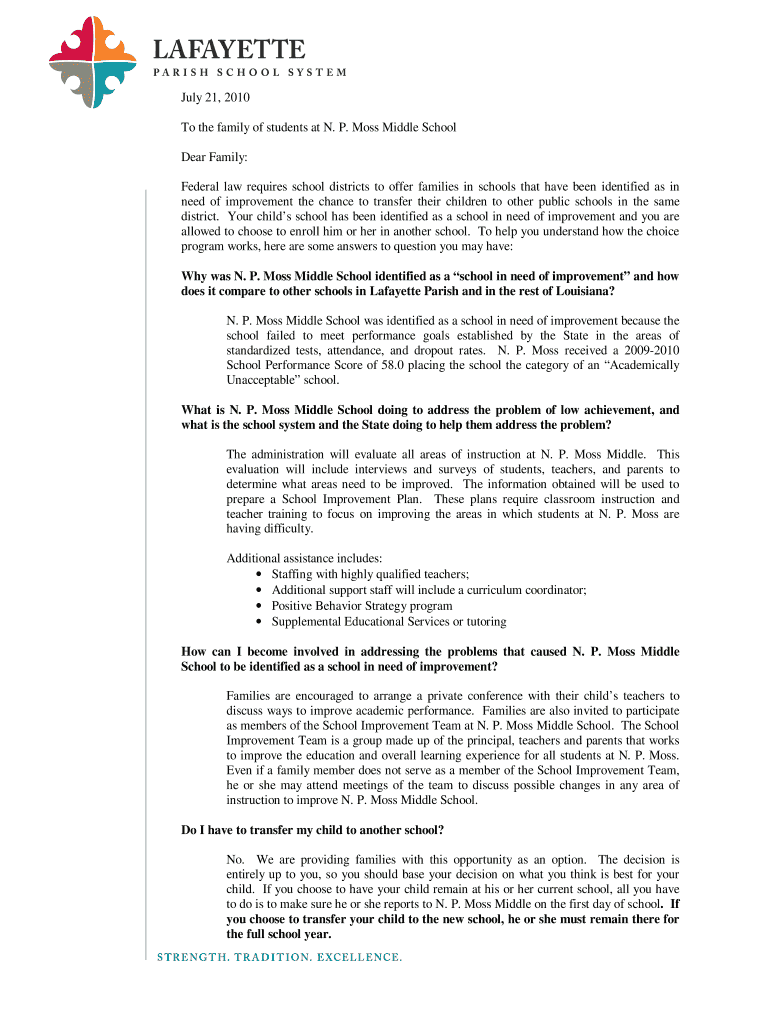 This document provides information to families about the option to transfer their children from N. P. Moss Middle School, which has been identified as a school in need of improvement, to another public
