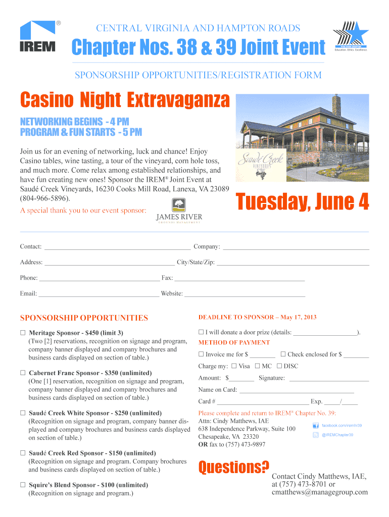 Central Virginia and Hampton Roads Chapter Nos. 38 & 39 Joint Event FIVE-STAR CHAPTER Education. Ethics. Excellence. Sponsorship Opportunities/Registration Form Casino Night Extravaganza Networking