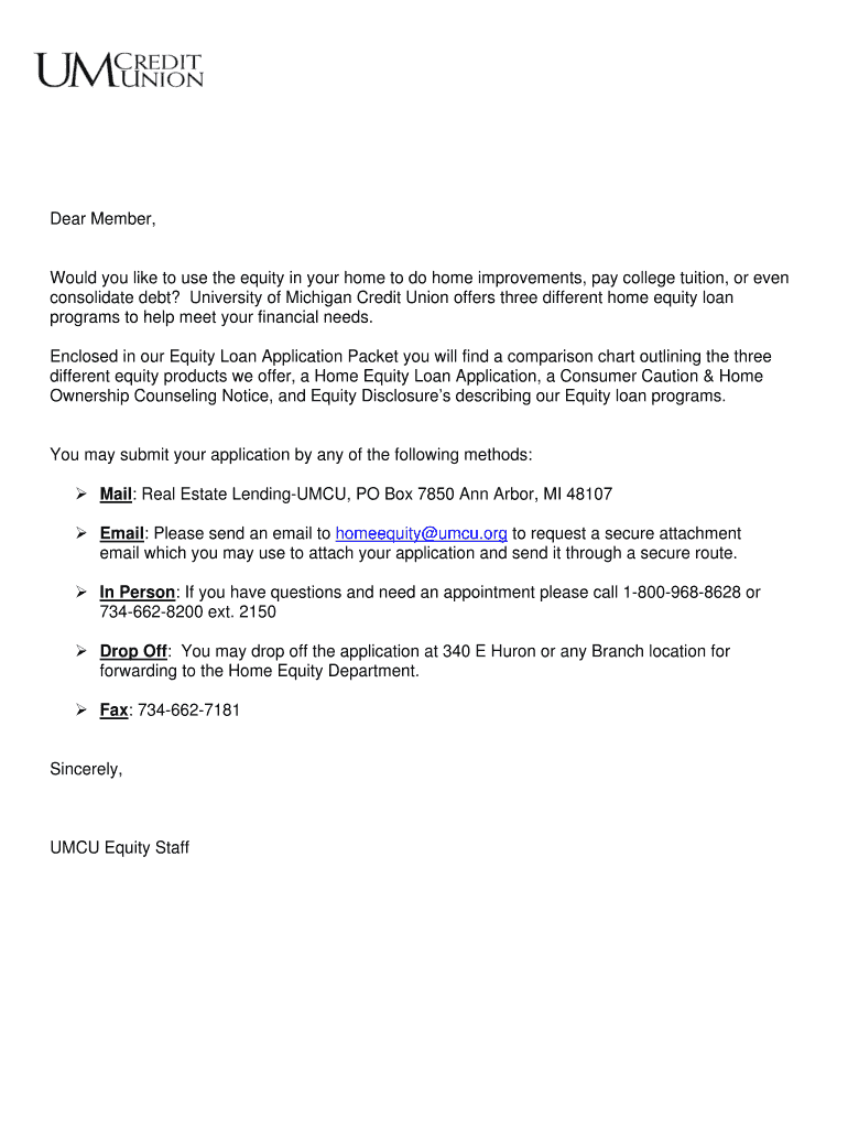 Dear Member, Would you like to use the equity in your home to do home improvements, pay college tuition, or even consolidate debt? University of Michigan Credit Union offers three different home equity