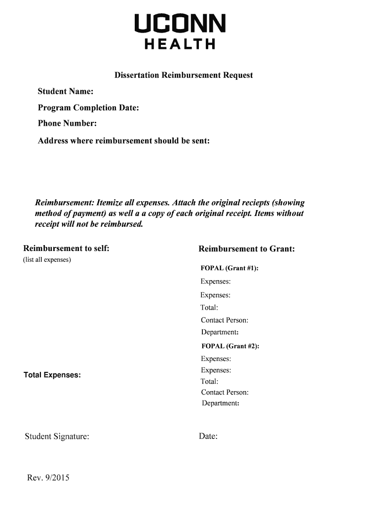 Dissertation Reimbursement Request Student Name: Program Completion Date: Phone Number: Address where reimbursement should be sent: Reimbursement: Itemize all expenses. Attach the original receipts
