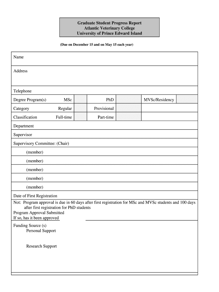 Graduate Student Progress Report Atlantic Veterinary College University of Prince Edward Island (Due on December 15 and on May 15 each year)