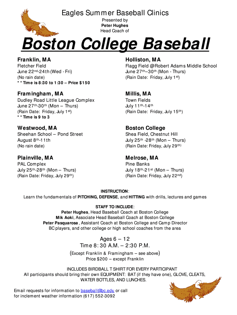 Application form for registration in the Eagles Summer Baseball Clinics conducted by Boston College Baseball for children aged 6-12.
