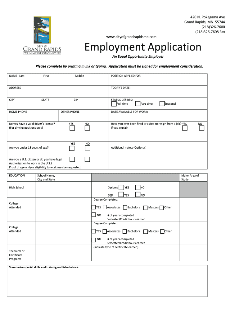 420 N. Tokugawa Ave Grand Rapids, MN 55744 (218)326 7600 (218)326 7608 Fax www.cityofgrandrapidsmn.com Employment Application An Equal Opportunity Employer Please complete by printing in ink or typing.