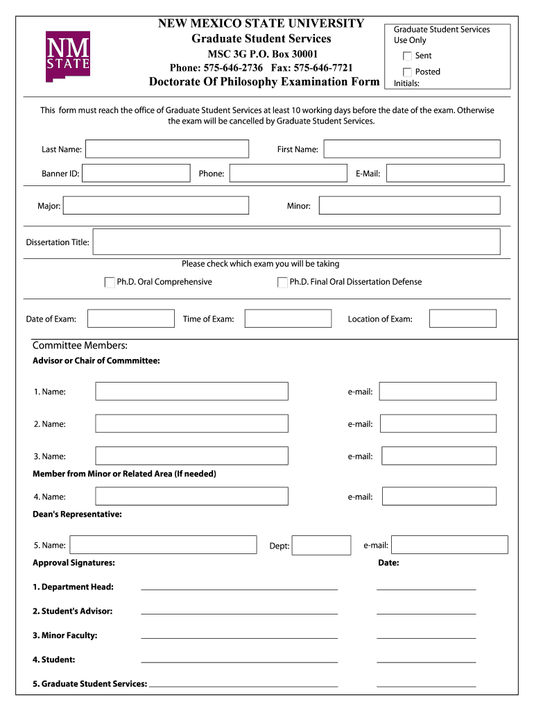 NEW MEXICO STATE UNIVERSITY Graduate Student Services Graduate Student Services Use Only MSC 3G P.O. Box 30001 Phone: 5756462736 Fax: 5756467721 Sent Doctorate Of Philosophy Examination Form Posted