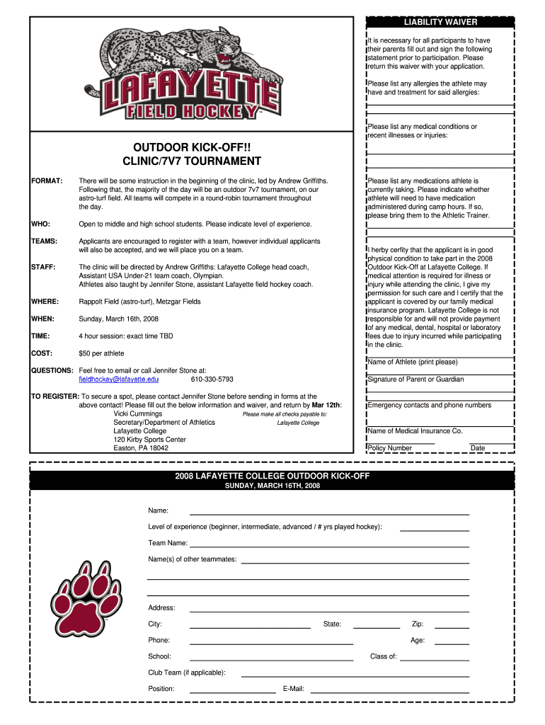 This document serves as a liability waiver for participants in the Outdoor Kick-Off Clinic and 7v7 Tournament at Lafayette College, requiring parental consent for participation and detailing necessary