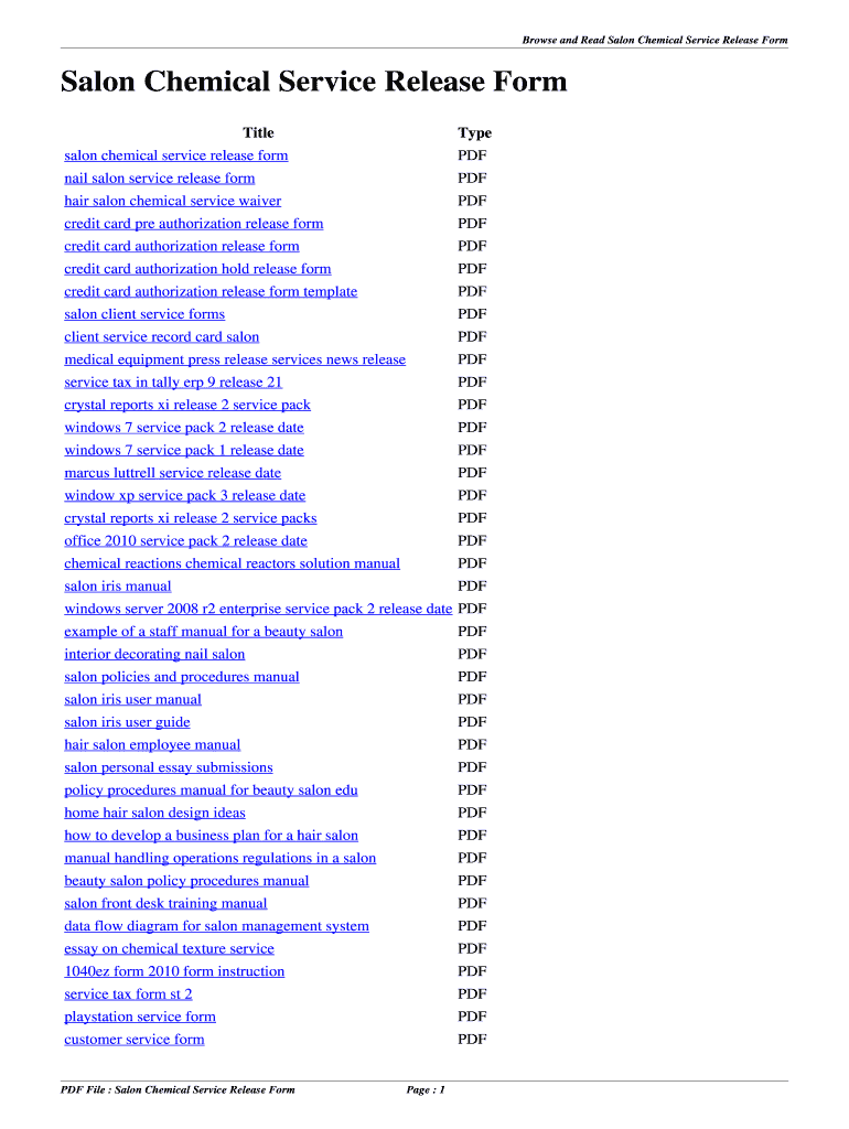 Browse and Read Salon Chemical Service Release Form. Title Type 2012 form 1040a internal revenue service PDF computer service request form Selma Alabama PDF.
