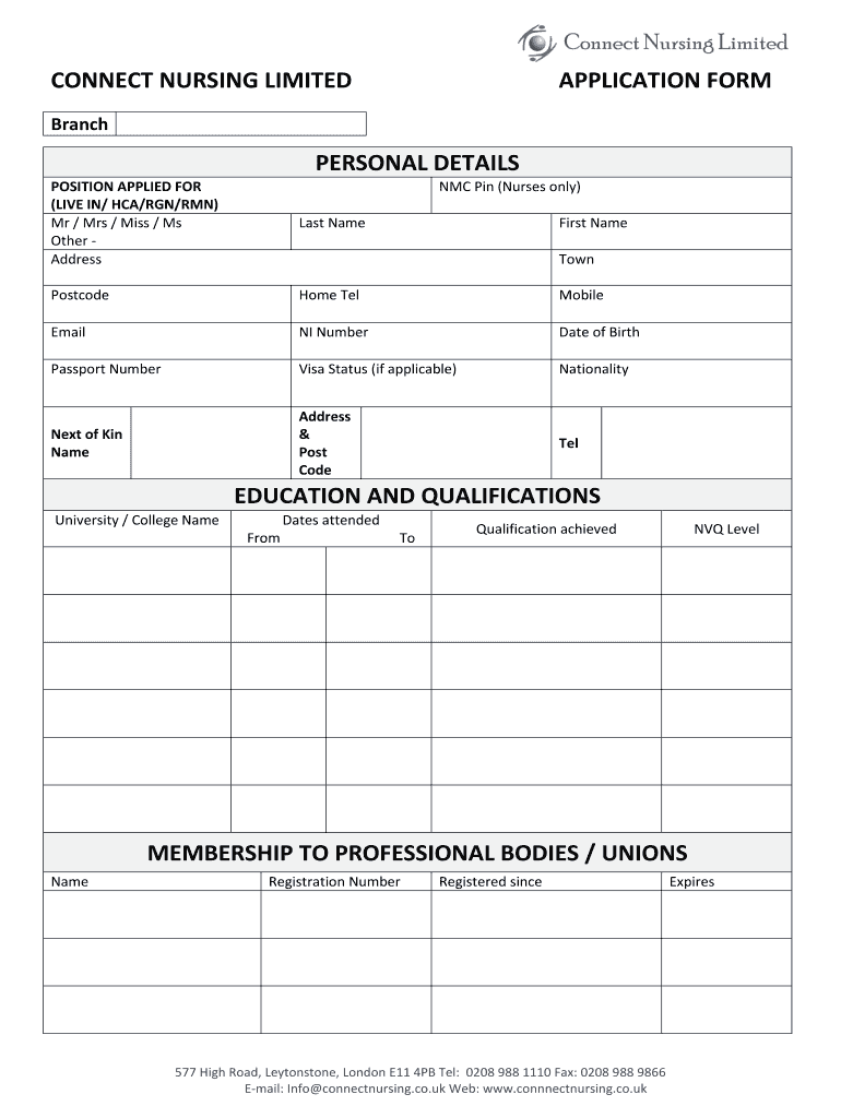 577 High Road, Leytonstone, London E11 4 PB Tel: 0208 988 1110 Fax: 0208 988 9866 Email: Info connect nursing.co.UK Web: www.connnectnursing.co.uk Dear applicant, Thank you for inquiring and taking
