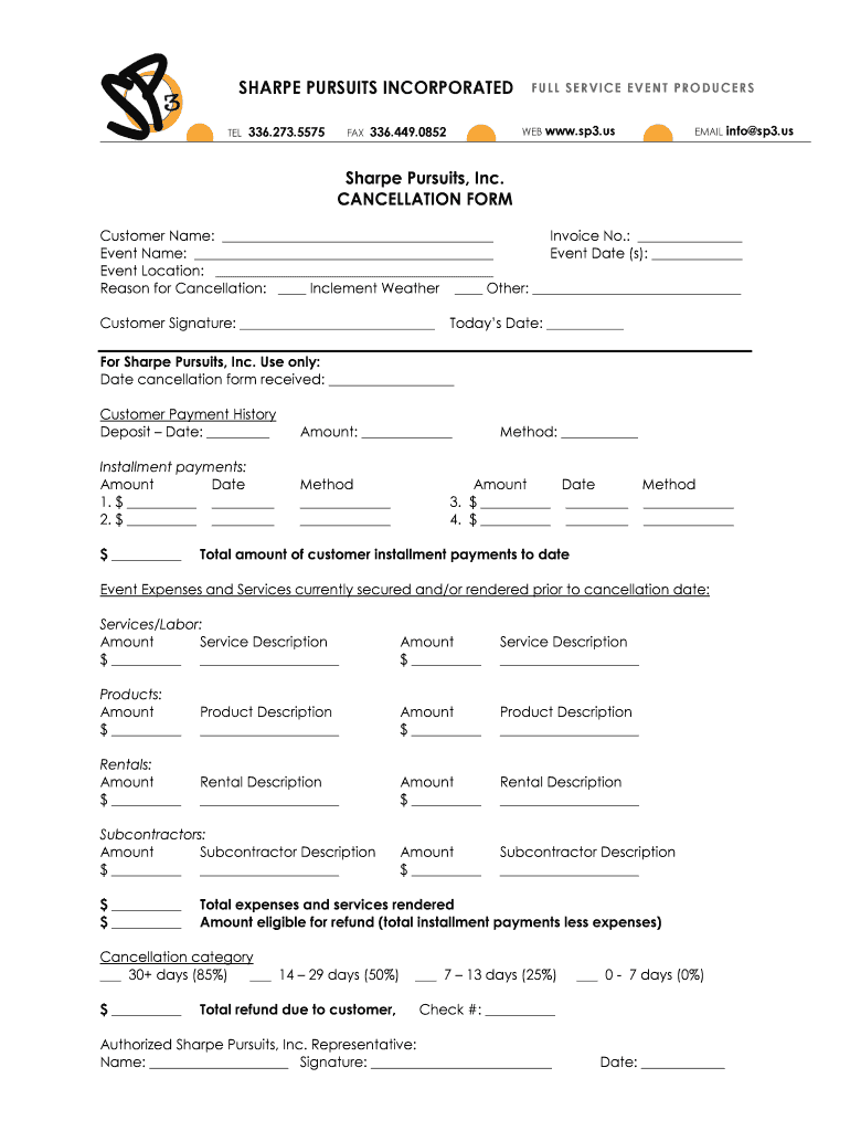 Sharpe Pursuits, Inc. CANCELLATION FORM Customer Name: Invoice No.: Event Name: Event Date (s): Event Location: Reason for Cancellation: Inclement Weather Other: Customer Signature: Today's Date: