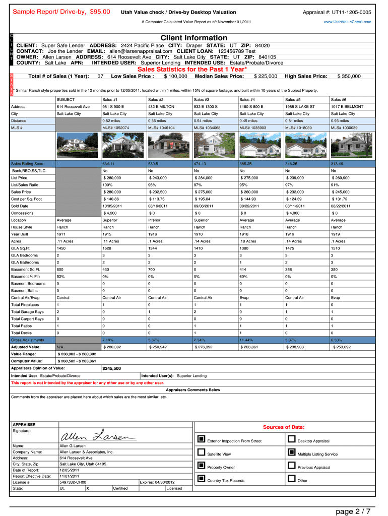 Sample Report/ Drive by, $95.00 Utah Value check / Drive by Desktop Valuation Appraisal #: UT1112050005 A Computer Calculated Value Report as of: November 01, 2011, C L I E N T www.UtahValueCheck.com