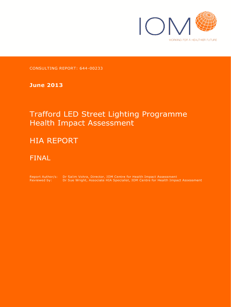CONSULTING REPORT: 64400233 June 2013 Trafford LED Street Lighting Program Health Impact Assessment HIA REPORT FINAL Report Author/s: Reviewed by: Dr Salem Vodka, Director, IOM Center for Health Impact