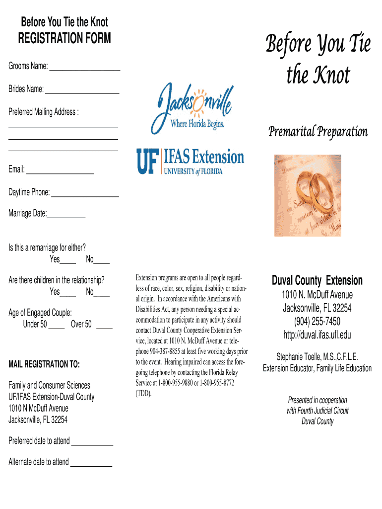 Before You Tie the Knot Before You Tie the Knot REGISTRATION FORM Grooms Name: Brides Name: Preferred Mailing Address : Premarital Preparation Email: Daytime Phone: Marriage Date: Is this a remarriage