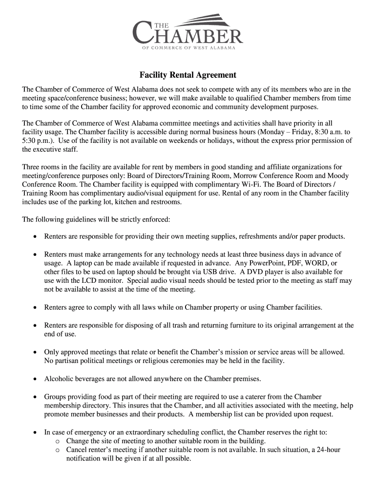 Facility Rental Agreement The Chamber of Commerce of West Alabama does not seek to compete with any of its members who are in the meeting space/conference business; however, we will make available