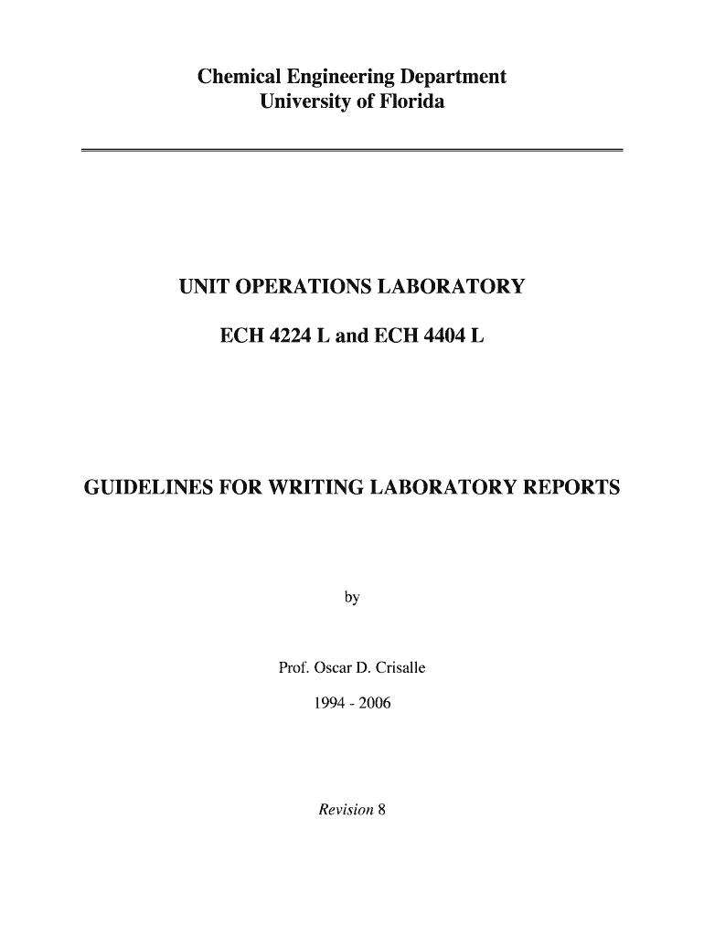 Chemical Engineering Department University of Florida UNIT OPERATIONS LABORATORY EACH 4224 L and EACH 4404 GUIDELINES FOR WRITING LABORATORY REPORTSbyProf. Oscar D. Grille 1994 2006Revision 8PREFACEThese