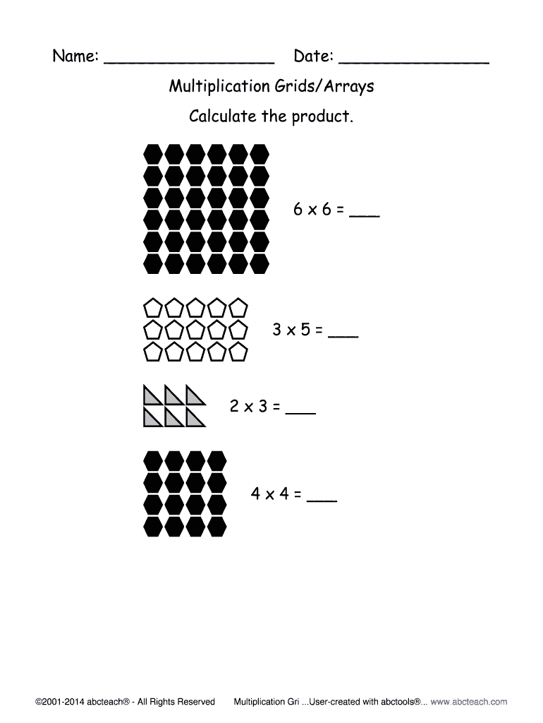 Name: Date: Multiplication Grids/Arrays Calculate the product. 6 × 6 3 × 5 2 × 3 4 × 4 20012014 beach All Rights Reserved Multiplication GRI ... User created with schools... www.abcteach.com Answers