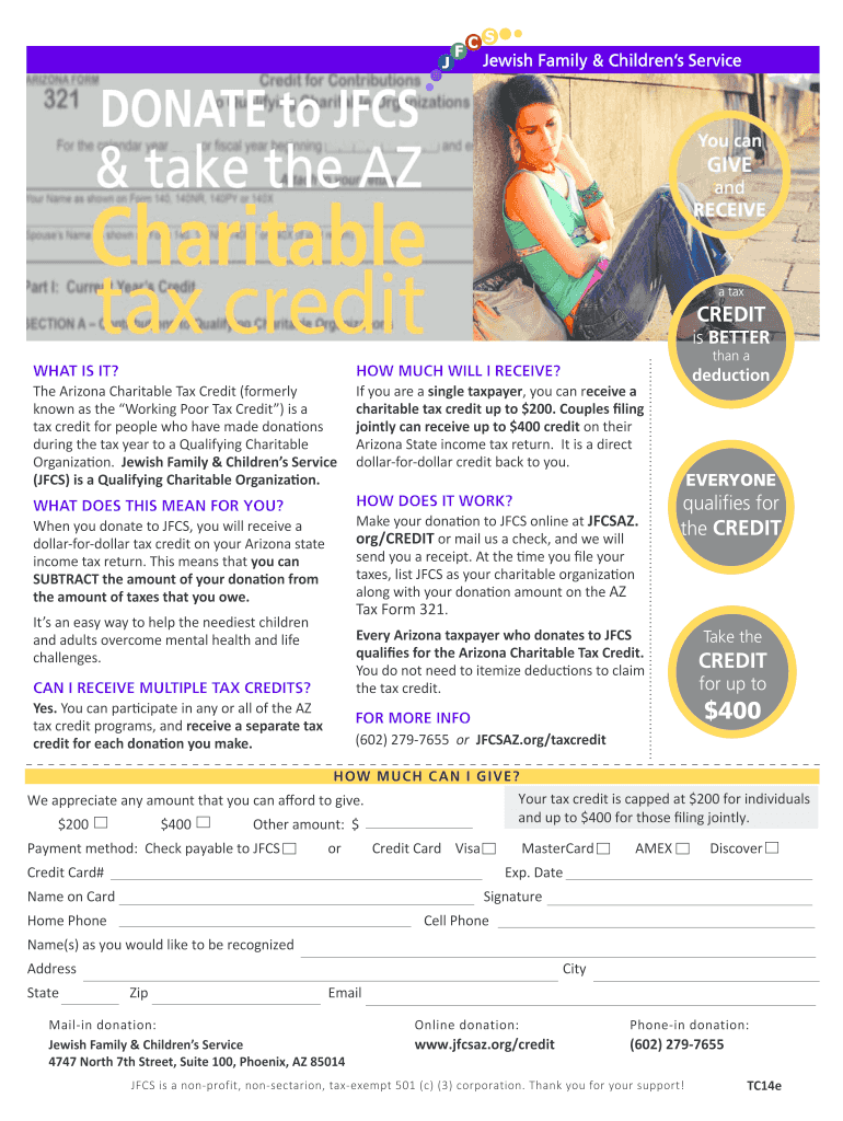 Jewish Family & Children's Service a tax CREDIT is BETTER than a WHAT IS IT? The Arizona Charitable Tax Credit (formerly known as the Working Poor Tax Credit) is a tax credit for people who have made