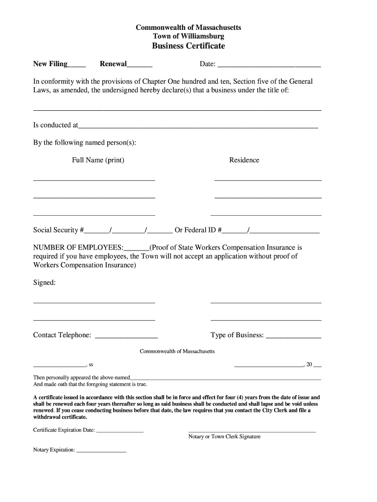 Commonwealth of Massachusetts Town of Williamsburg Business Certificate New Filing Renewal Date: In conformity with the provisions of Chapter One hundred and ten, Section five of the General Laws,